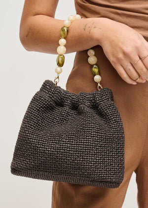 Pearled-bead top handle with a slouchy woven shape — Emery Crossbody. Woven silhouette, statement beaded top handle, detachable adjustable shoulder strap. Drawstring closure, quick access, interior roomy enough for phone, wallet, keys. Lightweight and versatile, perfect for daytime errands or evening plans, pairs with tailored or relaxed looks. Trend-right details, practical functionality, a standout everyday crossbody.