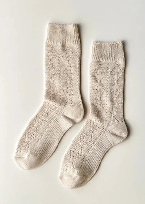 A refreshing take on pointelle. Delicate in detail, the Modal Eyelet Sock echoes the look of our Pointelle Cashmere with a similar knit pattern, while feeling closer in weight to the Trouser Sock. Soft with a silky-smooth hand, it’s the perfect pair for lighter seasons—made to wear with sandals and flats.